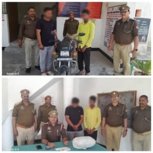 सोनभद्र। पुलिस अधीक्षक सोनभद्र अशोक कुमार मीणा के निर्देशन में अपर पुलिस अधीक्षक (मुख्यालय) व क्षेत्राधिकारी नगर के निकट पर्यवेक्षण में दिनांक 01.03.2025 को रात्रि लगभग 23.45 बजे थाना चोपन पुलिस द्वारा मुखबिर की सूचना पर मन्नु मिस्त्री चौराहा गड़ईडीह चोपन के पास से 02 नफर अभियुक्तगण 01. मनोज यादव उर्फ अनुज पुत्र स्व0 सुरेश यादव 02. विजय शंकर यादव पुत्र शम्भू यादव निवासीगण ग्राम महुआंव खुर्द थाना चोपन जनपद सोनभद्र के पास से 02.016 कि0ग्रा0 नाजायज गांजा, 01 अदद मोबाइल फोन, 01 अदद मोटरसाइकिल नम्बर UP64 AX3886 व गांजा बिक्री का कुल 15120/- रुपये नगद के साथ 02 नफर अभियुक्तगण को गिरफ्तार किया गया। जिसके सम्बन्ध में थाना चोपन पर मु0अ0सं0-66/2025 धारा 8/20/29/60 एनडीपीएस एक्ट का अभियोग पंजीकृत कर अभियुक्तगण को मा० न्यायालय भेजा गया।