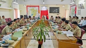 पुलिस महानिरीक्षक विंध्याचल परिक्षेत्र मिर्जापुर द्वारा पुलिस लाइन चुर्क के सभागार कक्ष में जनपद के समस्त अधिकारीगण के साथ आगामी त्यौहारों व जनपद में शांति/सुरक्षा व्यवस्था के दृष्टिगत की गयी अपराध समीक्षा बैठक।