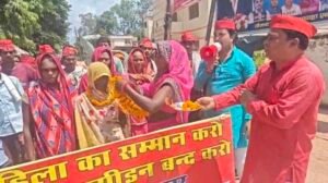 सोनभद्र। के राबर्ट्सगंज में समाजवादी पार्टी के कार्यकर्ताओं ने एक अलग अंदाज़ में प्रदर्शन किया। राम-जानकी मंदिर के पास सपा कार्यकर्ताओं ने महिला कार्यकर्ताओं को माला पहनाकर और आरती उतारकर सम्मान किया और इसी बहाने प्रदेश और केंद्र सरकार के खिलाफ मोर्चा खोल दिया। कार्यकर्ताओं का कहना है कि कन्नौज में महिलाओं पर पुलिस लाठीचार्ज भाजपा सरकार के महिला सम्मान के दावों की पोल खोलता है।