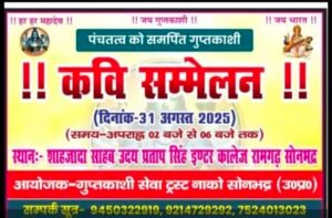 सोनभद्र। शाहजादा साहब इंटर कॉलेज रामगढ़ में आगामी 31 अगस्त को कवि सम्मेलन का आयोजन किया गया है। यह आयोजन गुप्तकाशी सेवा ट्रस्ट नाको, सोनभद्र की ओर से किया गया है। गुप्तकाशी सेवा ट्रस्ट नाको सोनभद्र के संयोजक/ कार्यक्रम आयोजक रवि प्रकाश चौबे ने बताया कि 31 अगस्त रविवार को दोपहर बाद दो बजे से छ बजे शाम तक शाहजादा साहब उदय प्रताप सिंह इंटर कालेज रामगढ़ में कवि सम्मेलन का आयोजन किया गया है। कवि सम्मेलन की अध्यक्षता वरिष्ठ साहित्यकार अजय शेखर जी करेंगे जबकि मुख्य अतिथि जिलाधिकारी सोनभद्र,विशिष्ट अतिथिगण