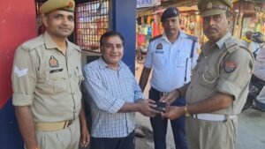 सोनभद्र। दिनांक 30.09.2025 को थाना क्षेत्र रॉबर्ट्सगंज क्षेत्रान्तर्गत शीतला चौक पर दयाराम यादव जी का पर्स गिर गया था, जिसमें कुछ नगद राशि के साथ-साथ आवश्यक दस्तावेज जैसे आधार कार्ड, पैन कार्ड एवं एटीएम कार्ड मौजूद थे। घटना की जानकारी मिलने पर शीतला चौराहे पर तैनात टीएसआई संजय कुमार सिंह एवं अन्य उपस्थित कर्मचारियों ने तत्परता एवं ईमानदारी का परिचय देते हुए पर्स को सुरक्षित रखा। तत्पश्चात दयाराम यादव जी से दूरभाष के माध्यम से संपर्क किया गया और निर्धारित स्थान शीतला चौराहे पर बुलाकर उनका पर्स सकुशल सुपुर्द किया गया। यह घटना आम नागरिकों के बीच पुलिस और प्रशासन के प्रति विश्वास को और भी सुदृढ़ करती है। संजय कुमार सिंह तथा संबंधित कर्मचारियों का यह कार्य सराहनीय एवं प्रेरणास्पद है।