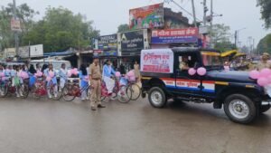 सोनभद्र। मिशन शक्ति 5.0 अभियान के क्रम में पुलिस अधीक्षक सोनभद्र अभिषेक वर्मा के निर्देशन में, अपर पुलिस अधीक्षक अनिल कुमार के पर्यवेक्षण व क्षेत्राधिकारी दुद्धी राजेश कुमार राय के नेतृत्व में राजकीय बालिका इंटर कॉलेज दुद्धी की छात्राओं द्वारा साइकिल रेस का आयोजन किया गया। इस रेस का शुभारम्भ क्षेत्राधिकारी दुद्धी द्वारा हरी झण्डी दिखाकर किया गया। इस अवसर पर प्रभारी निरीक्षक दुद्धी स्वतंत्र कुमार सिंह, महिला थानाध्यक्ष दुद्धी सुश्री सन्तु सरोज तथा मिशन शक्ति दुद्धी टीम एवं एण्टी रोमियो स्क्वॉड की महिला कर्मियों द्वारा प्रतिभागी छात्राओं को महिला सुरक्षा, आत्मरक्षा, हेल्पलाइन नंबरों एवं साइबर जागरूकता संबंधी जानकारी दी गई। कार्यक्रम के माध्यम से छात्राओं में आत्मविश्वास, सुरक्षा जागरूकता एवं सामाजिक सहभागिता की भावना को प्रोत्साहित किया गया।