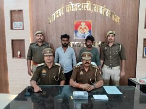 सोनभद्र। पुलिस अधीक्षक अभिषेक वर्मा द्वारा अपराध एवं अपराधियों के विरुद्ध चलाए जा रहे अभियान के क्रम में अपर पुलिस अधीक्षक मुख्यालय अनिल कुमार व क्षेत्राधिकारी नगर रणधीर कुमार मिश्रा के पर्यवेक्षण में थाना रॉबर्ट्सगंज पुलिस द्वारा झपट्टा मारकर मोबाइल फोन छीनने वाले दो अभियुक्तों को गिरफ्तार कर लिया गया। दिनांक 12.06.2025 को युगल किशोर पुत्र स्व0 श्यामु निवासी ग्राम कुतुलुपुर थाना रॉबर्ट्सगंज की पुत्री मधुपुर बाजार से अपने घर वापस जा रही थी। इसी दौरान ग्राम बट के पास अज्ञात व्यक्तियों द्वारा झपट्टामारी कर उसका मोबाइल फोन छीन लिया गया था। घटना के संबंध में थाना रॉबर्ट्सगंज पर मु0अ0सं0 1089/2025 धारा 304(2) बीएनएस के अंतर्गत अभियोग पंजीकृत किया गया था। आज दिनांक 04.11.2025 को मुखबिर की सूचना पर थाना रॉबर्ट्सगंज पुलिस द्वारा रेलवे स्टेशन रोड, रॉबर्ट्सगंज से दो शातिर अभियुक्तों —
