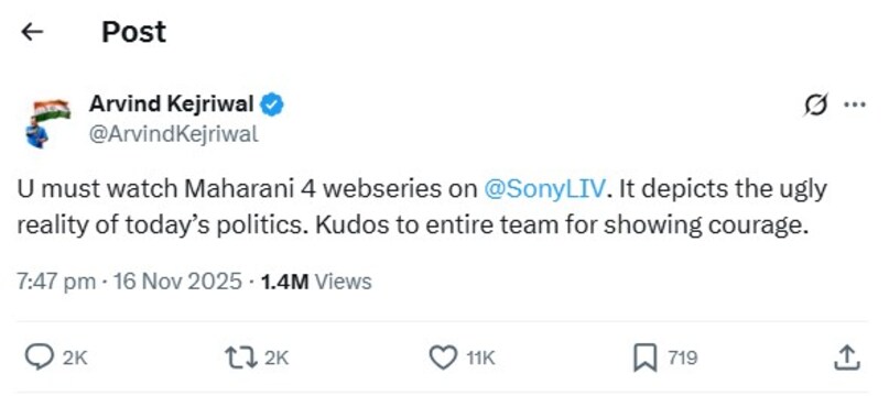 हाल ही में अरविदं केजरीवाल ने एक पोस्ट शेयर की, जिसमें लिखा कि लोग SonyLIV पर ‘महारानी 4’ को देखना ना भूलें. क्योंकि ये सीरीज़ राजनीति की कड़वी सच्चाई को दर्शाती है. उनका ये पोस्ट सोशल मीडिया पर आते ही वायरल हो गया है. उनकी पोस्ट पर लोग अपनी राय जाहिर कर रहे हैं. इस पोस्ट के बाद कोई उनकी तारीफ कर रहा है तो कोई उनकी तारीफ कर रहा है.