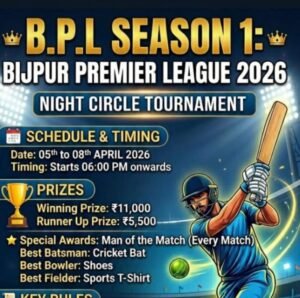 बीजपुर (सोनभद्र ) प्रीमियर लीग रात्रि कालीन सर्किल टूर्नामेंट का आगाज आज बतौर मुख्य अतिथि थाना अध्यक्ष बीजपुर श्री राजेश सिंह जी एवं विशिष्ट अतिथि के रूप में श्री राजेश पांडे जी साइड इंचार्ज एनर्जियो प्राइवेट लिमिटेड के कर कमल द्वारा ठीक सायं 6:30 बजे संपन्न होगा। प्रतियोगिता में अलग-अलग राज्यों से 16 टीमों की भिड़ंत होगी खीताबी मुकाबले के लिए। उद्घाटन मैच यंग बॉयज बीजपुर और चपकी के मध्य खेला जाएगा तथा दूसरा हाई वोल्टेज मुक़ाबला महरीकला वर्सेस एनजीओ बॉयज के मध्य खेला जाएगा तथा तीसरा मुकाबला रिहंद नाइट राइडर्स वर्सेस शांतिनगर जेन जेड के मध्य खेला जाएगा। आइए और शानदार मुकाबला का आनंद लीजिए ।