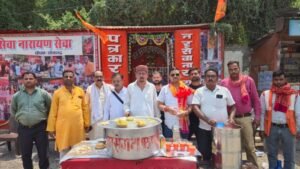 चोपन/सोनभद्र। नगर क्षेत्र में विगत तीन वर्षों से निरंतर संचालित हो रहे नर सेवा नारायण सेवा संस्थान द्वारा मानव सेवा का सराहनीय कार्य जारी है। संस्थान के तत्वावधान में समाज के सहयोग से प्रत्येक शनिवार को जरूरतमंदों एवं राहगीरों के लिए निःशुल्क खिचड़ी वितरण कार्यक्रम आयोजित किया जाता है। इसके साथ ही समय-समय पर कंबल, गमछा सहित अन्य आवश्यक वस्तुओं का भी वितरण किया जाता रहा है। इसी क्रम में शनिवार को आयोजित 127 वें साप्ताहिक सेवा कार्यक्रम के तहत बढ़ती गर्मी को देखते हुए खिचड़ी के साथ ठंडा शर्बत भी राहगीरों एवं जरूरतमंदों को वितरित किया गया। तेज धूप और बढ़ते तापमान के बीच ठंडा शर्बत पाकर लोगों को काफी राहत मिली और उन्होंने संस्थान के इस प्रयास की सराहना की। संस्थान के कार्यकर्ताओं ने बताया कि उनका उद्देश्य केवल भोजन वितरण तक सीमित नहीं है, बल्कि समाज के हर जरूरतमंद व्यक्ति तक सहायता पहुंचाना है। गर्मी के मौसम में लोगों को राहत देने के लिए शर्बत वितरण की व्यवस्था की गई है, ताकि राहगीरों को गर्मी से कुछ राहत मिल सके। कार्यक्रम में संस्थान से जुड़े स्वयंसेवकों ने सक्रिय भूमिका निभाते हुए सेवा कार्य को सफल बनाया। इस दौरान बड़ी संख्या में लोगों ने खिचड़ी एवं शर्बत ग्रहण किया। नर सेवा नारायण सेवा संस्थान के संयोजक मनोज चौबे ने बताया कि जबतक आगे वाले प्रत्येक शनिवार को खिचड़ी के साथ शर्बत वितरण किया जाएगा उन्होंने समाज के लोगों से आग्रह किया है कि इस पुनीत कार्य से जुड़कर मानव सेवा में अपना योगदान करें क्योंकि समाज के सहयोग से ही