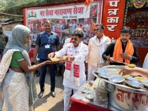 चोपन/सोनभद्र। नगर के टैंपो स्टैंड पर विगत तीन वर्षों से संचालित नर सेवा नारायण सेवा संस्थान द्वारा मानव सेवा का सराहनीय कार्य निरंतर जारी है। संस्थान के तत्वावधान में समाज के सहयोग से प्रत्येक शनिवार को जरूरतमंदों एवं राहगीरों के लिए निःशुल्क खिचड़ी वितरण कार्यक्रम आयोजित किया जाता है। इसके साथ ही समय-समय पर कंबल, गमछा सहित अन्य आवश्यक वस्तुओं का भी वितरण किया जाता रहा है। इसी क्रम में शनिवार को आयोजित 128वें साप्ताहिक सेवा कार्यक्रम में उत्तर प्रदेश सरकार के समाज कल्याण राज्य मंत्री संजीव सिंह गोंड़ ने अपने हाथों से जरूरतमंदों को खिचड़ी एवं शर्बत वितरित किया। उन्होंने कहा कि नर सेवा नारायण सेवा द्वारा किया जा रहा यह पुनीत कार्य अत्यंत सराहनीय है, जिसकी जितनी भी प्रशंसा की जाए कम है। बताते चलें कि बढ़ती गर्मी को देखते हुए पिछले सप्ताह से संस्थान द्वारा खिचड़ी के साथ ठंडा शर्बत भी राहगीरों एवं जरूरतमंदों को वितरित किया जा रहा है, जिसमें समाज के लोगों का भरपूर सहयोग मिल रहा है। तेज धूप और बढ़ते तापमान के बीच ठंडा शर्बत पाकर लोगों को काफी राहत मिली और उन्होंने संस्थान के इस प्रयास की सराहना की।संस्थान के संयोजक मनोज चौबे ने बताया कि उनका उद्देश्य केवल भोजन वितरण तक सीमित नहीं है, बल्कि समाज के हर जरूरतमंद व्यक्ति तक सहायता पहुंचाना है। गर्मी के मौसम में लोगों को राहत देने के लिए शर्बत वितरण की व्यवस्था की गई है, ताकि राहगीरों को गर्मी से कुछ राहत मिल सके। इस दौरान बड़ी संख्या में लोगों ने खिचड़ी एवं शर्बत ग्रहण किया। संस्थान के पदाधिकारियों ने समाज के सहयोग के लिए आभार व्यक्त करते हुए कहा कि जनसहयोग से ही इस प्रकार के सेवा कार्य निरंतर जारी रहेंगे। इस मौके पर वरिष्ठ भाजपा नेता राजा मिश्रा, दयाशंकर सिंह, संजय केशरी, ओमप्रकाश शर्मा, सुनील मिश्रा, अमित कुमार, गोपाल मोदनवाल, गुड्डू सिंह गोंड़, शमसेर अली, मनीष कुमार, विनोद शर्मा आदि मौजूद रहे।